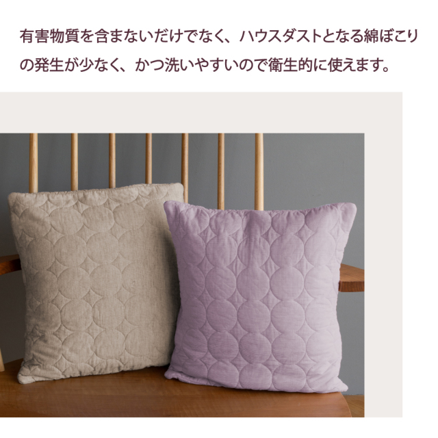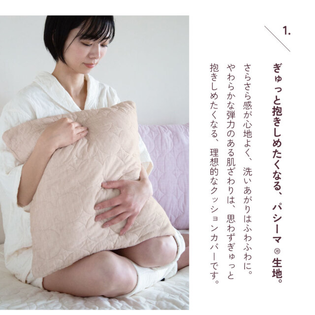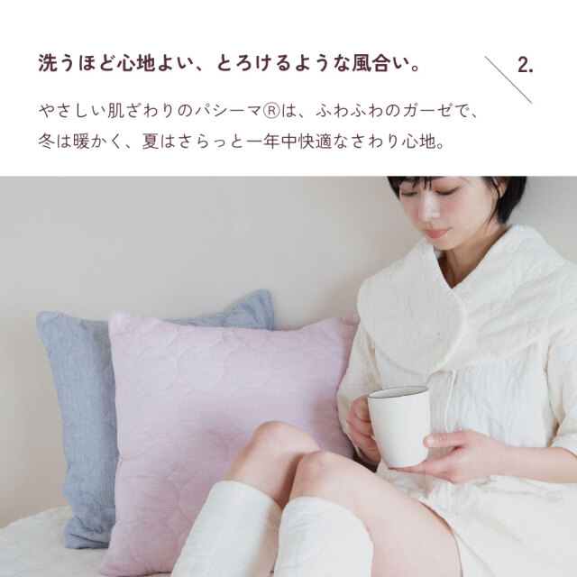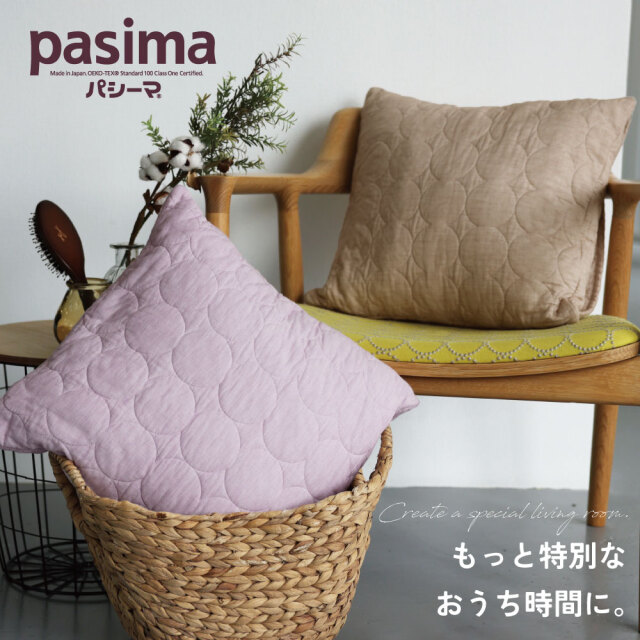 こだわり仕様の年中使えるガーゼ&脱脂綿のクッションカバー。 パシーマはエコテックススタンダード100クラスⅠを取得した体に全く害のない素材で作られております。 |